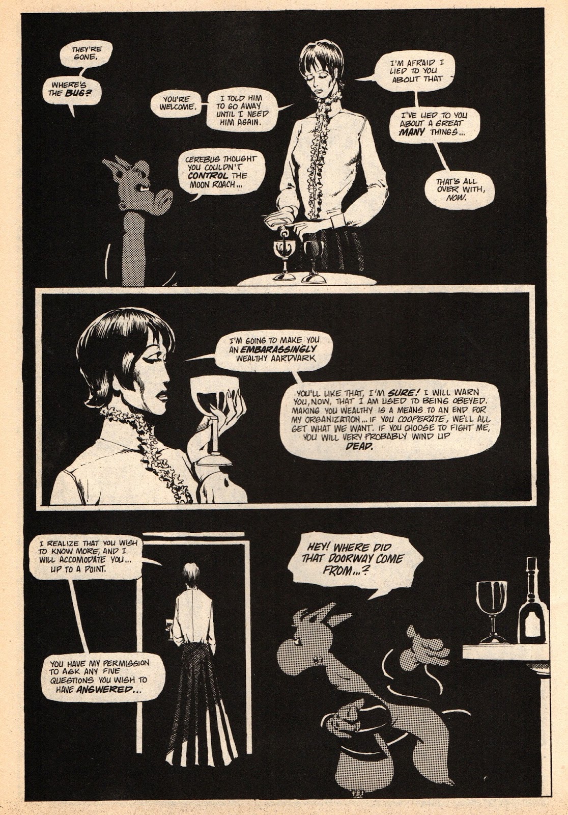 her back turned to him, Cerebus stands-in for the reader: ''Hey! Where did that doorway come from …?''